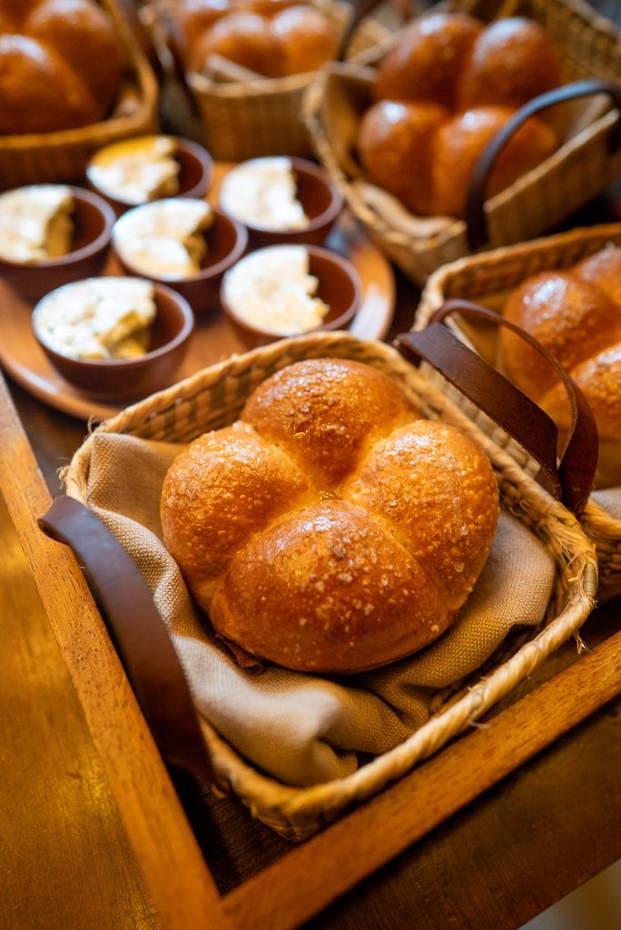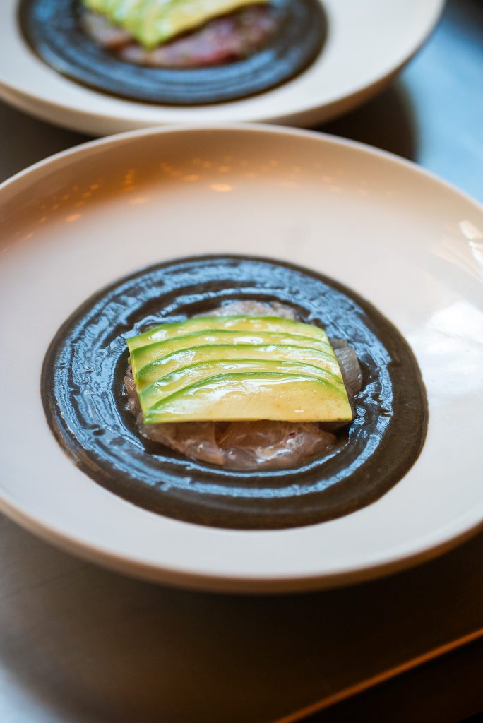 La comida fue un menú degustación de varios tiempos, diseñado por Shary Romo y Alex Chávez. Comenzó con un brioche estilo Parker house recién horneado con mantequilla al cebollín y miel de agave, pan suave que combinó lo dulce y lo salado. Continuó con una ensalada fresca de chícharos chinos con pecorino romano y jamón serrano, y luego un aguachile de ceniza con tomate y chile morita, acompañado de Kampachi kombujime, aguacate y cilantro. Estas entradas prepararon el paladar con toques cítricos, herbales y ligeramente ahumados, en armonía con los cócteles iniciales basados en Zacapa.