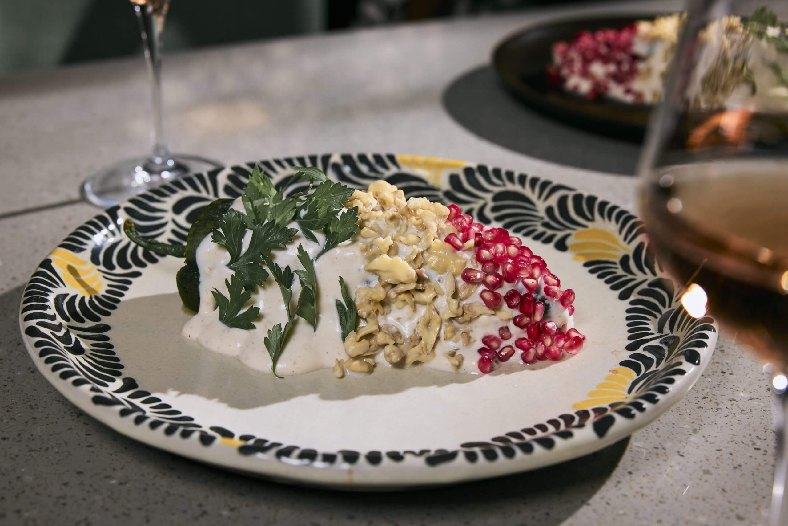 Nuestro chile en nogada favorito de los restaurantes del Palacio porque tiene el balance perfecto entre salado y dulce. Relleno de una mezcla de carne de res y cerdo, complementada con pera, durazno, manzana, almendra y pasas. Por supuesto, la salsa de nogada es elaborada con nuez de Castilla. Finalizando con granada fresca y un toque de perejil.