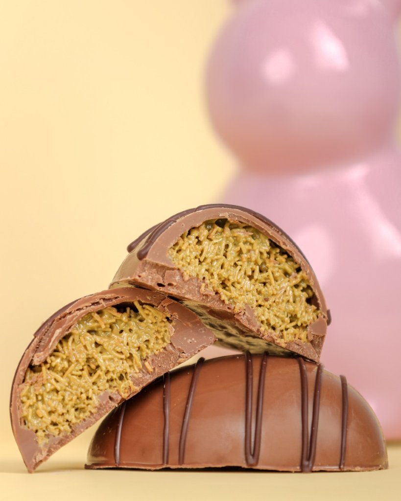 La combinación es sencillamente irresistible: crema de pistache, capas crujientes de kataifi (una especie de fideo dorado típico del Medio Oriente) y una cobertura de chocolate oscuro que brilla como joya. ¿El resultado? Textura, sabor y estética en su punto más alto.