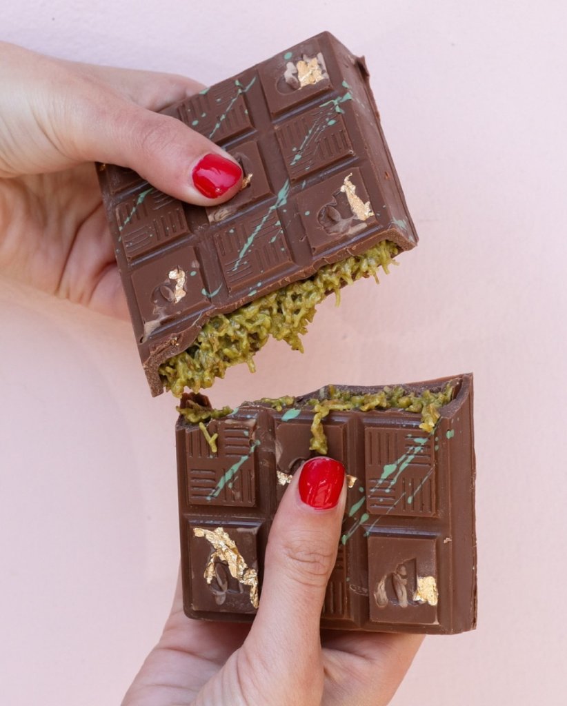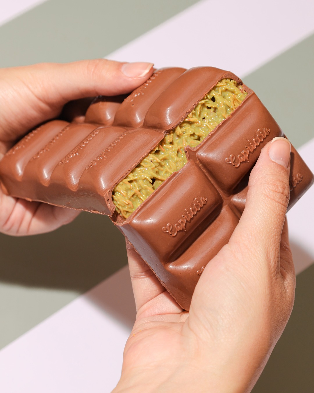 Este no es un chocolate cualquiera. Estamos hablando de una creación exclusiva de Fix Dessert Chocolatier, una marca originaria de Dubái que decidió llevar el lujo árabe al mundo dulce con su producto estrella: Can’t Get Knafeh of It.