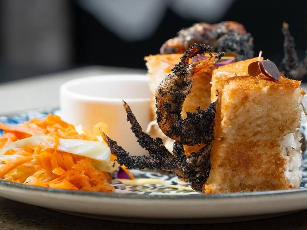 Uno de los platos más celebrados es el sanado de jaiba, servido en pan de arroz increíblemente crujiente, una joya que muestra influencia japonesa en la cocina del chef. Y para cerrar con broche de oro, un tamal de arroz con fruta macerada en sake, que refleja las raíces panaderas de Covarrubias con una sensibilidad oriental.