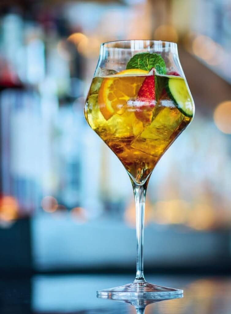 Inspirado en la clásica bebida veraniega británica, el Pimm’s Spritz es frutal, ligero y lleno de sabor gracias a su mezcla de especias y frutas. Ideal para un picnic o un brunch al estilo londinense.