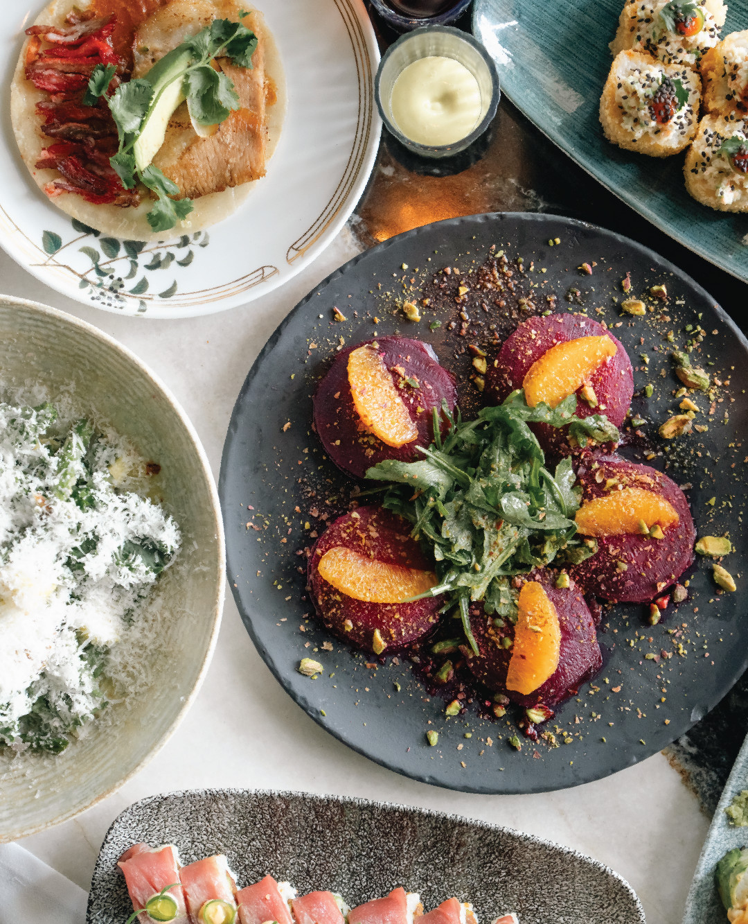 Menú: ravioles de betabel (2 pzs), barra japonesa (nigiris y makis), fuerte a elegir (short rib con puré de camote y ejotes almendrados o totoaba glaseada con puré de coliflor y hongos asados) y pastel de 3 leches.