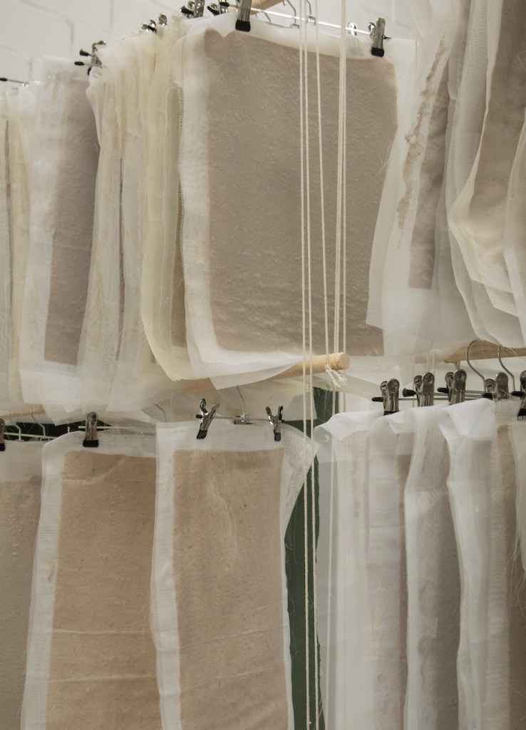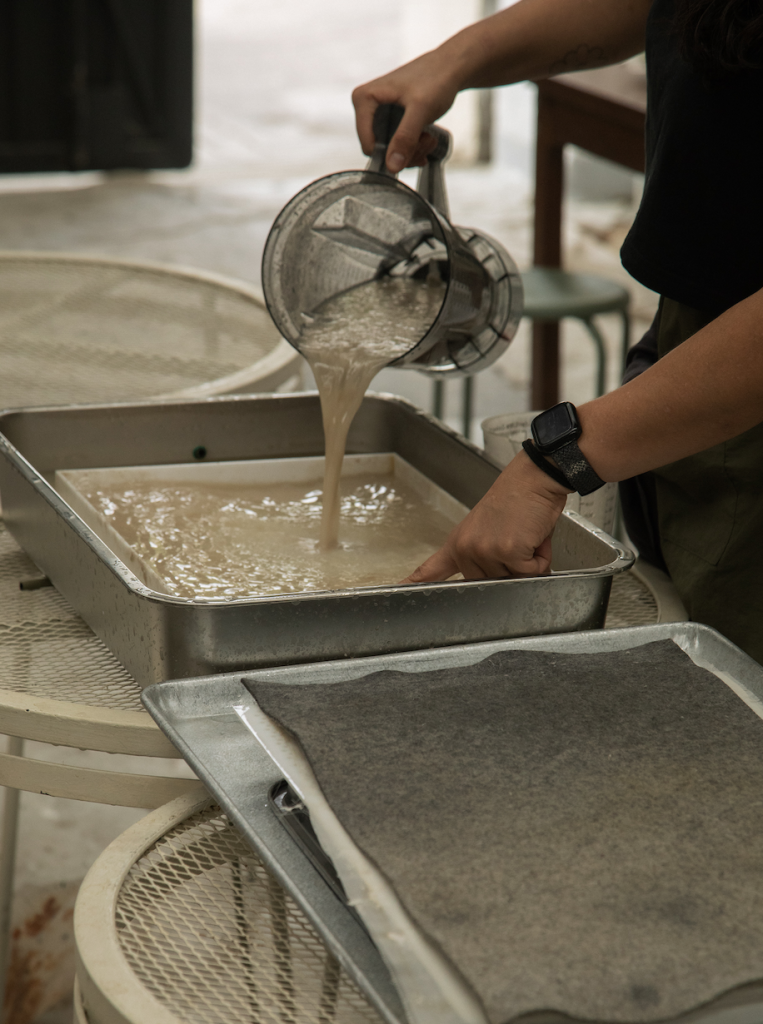 En su taller, el equipo normalmente procesa o trabaja con pan sobrante, masa fermentada, cáscaras de huevo y papel usado. Primero los trituran. Después los mezclan con agua u otros componentes naturales. Finalmente, aplican calor y presión para modificar su estructura. Así desarrollan láminas similares al papel, compuestos moldeables y adhesivos naturales.