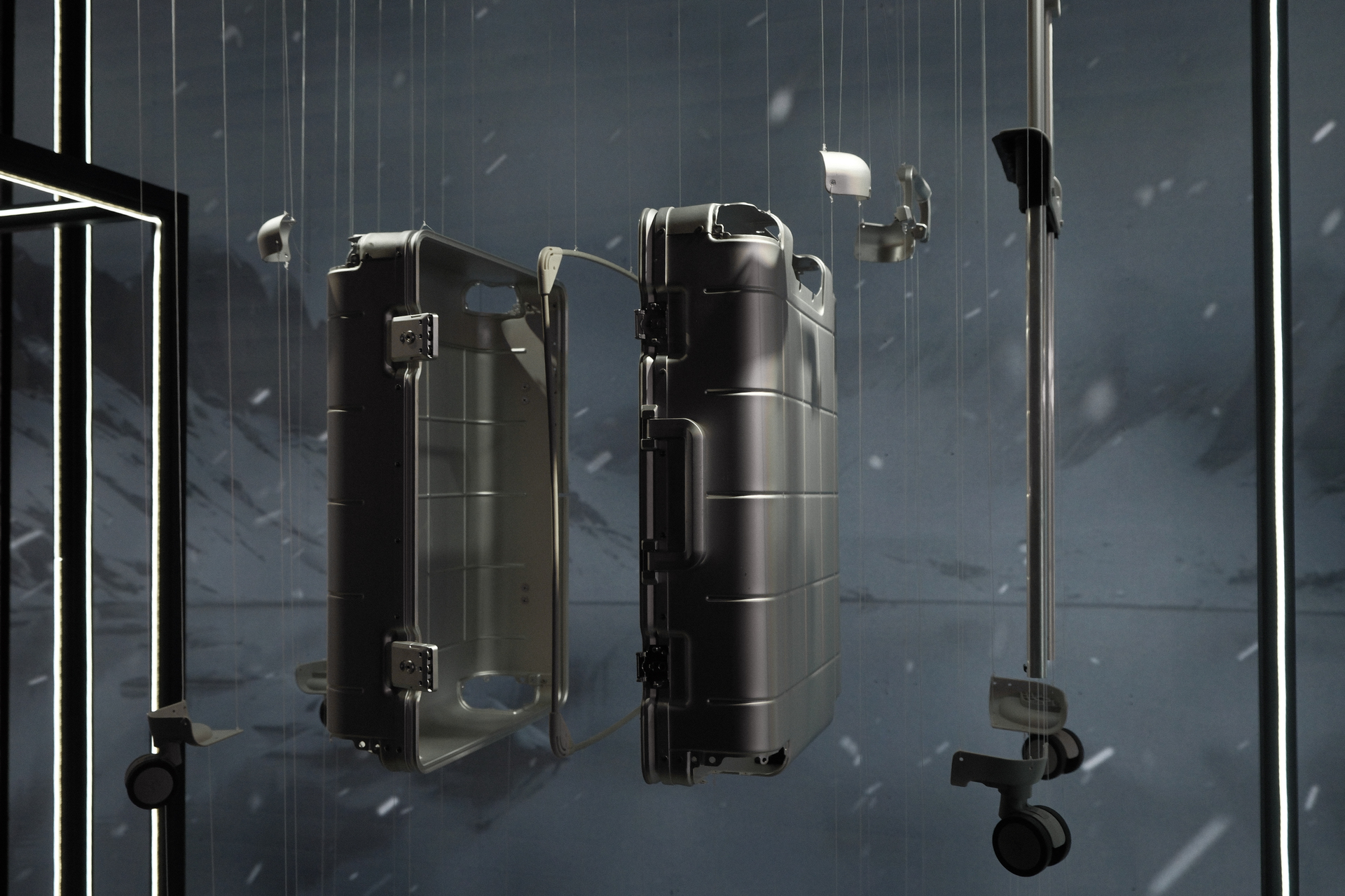 - Belleza que se sostiene en la ingeniería. Una maleta de aluminio desarmada y suspendida como escultura muestra lo que normalmente no vemos: materiales, precisión y proceso.