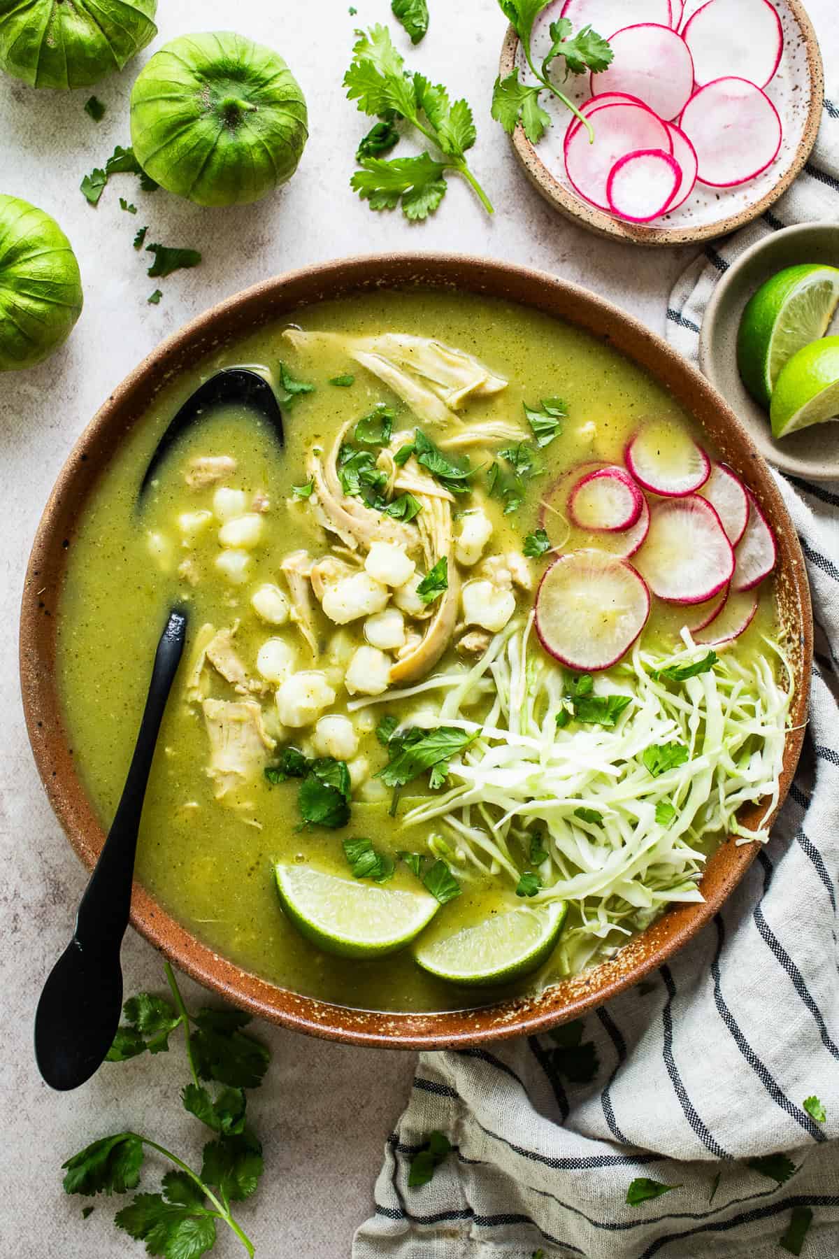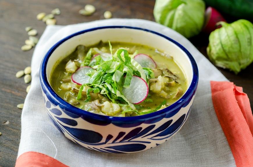 La versión verde destaca por su frescura: lleva tomatillos, chiles verdes (como poblano, jalapeño), cilantro, a veces pepitas de calabaza o epazote, y se suele preparar con pollo, generando una presentación aromática y vibrante. Es típico del estado de Guerrero, aunque también se hace en el Estado de México.