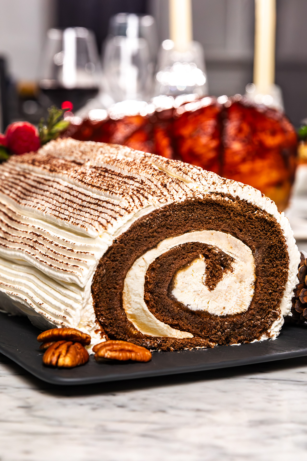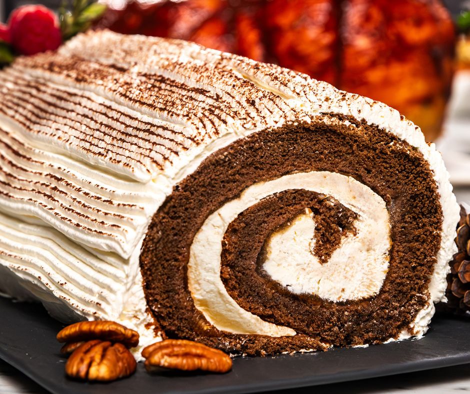 Para acompañar, hay un puré de papa rústico servido con gravy, y una ensalada Waldorf a base de yogurt y mayonesa, con manzana, apio, uva verde, arándano, nuez y miel: fresca, crujiente y perfecta para balancear el menú. El cierre dulce llega en forma de Tronco navideño de chocolate, con crema batida, compota de manzana con canela y praliné.