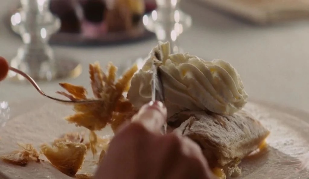 En la propuesta visual de la película, los macarons y dulces inspirados en la pastelería parisina construyen un universo propio. Aquí, la gastronomía no solo alimenta la historia: también la diseña. Los colores, las texturas y la abundancia de postres refuerzan la representación del exceso y la opulencia, y muestran que la comida también funciona como lenguaje estético.