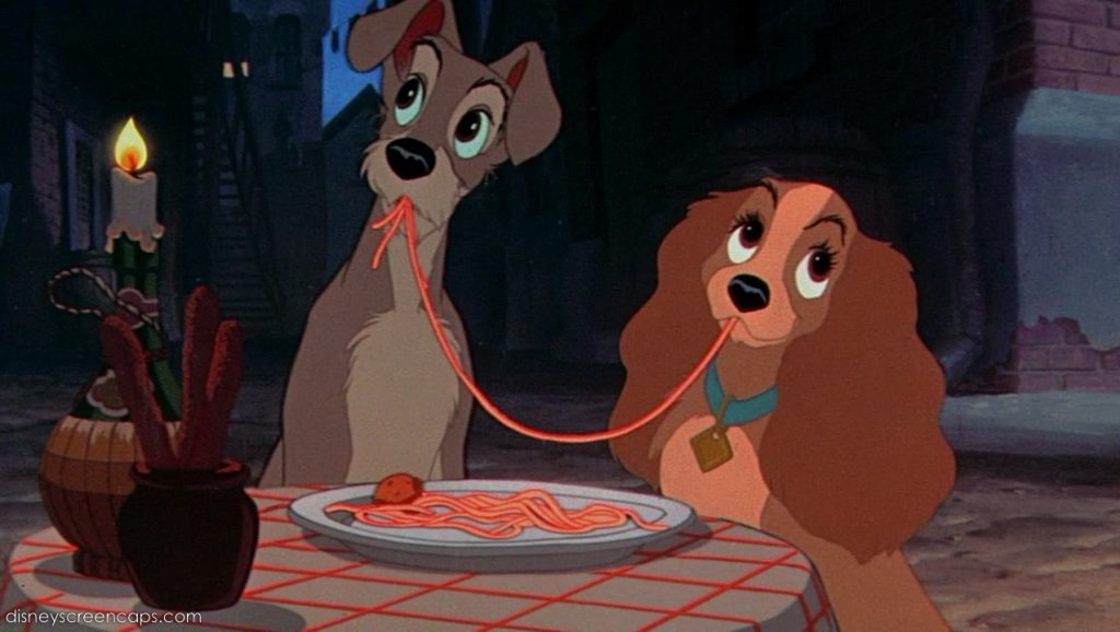 La escena del beso de la Dama y el Vagabundo compartiendo un plato de spaghetti es uno de los momentos más reconocibles, e icónicos, del cine animado. ¿Puedes creer que es de 1955? Más allá del romanticismo, simboliza intimidad y complicidad.